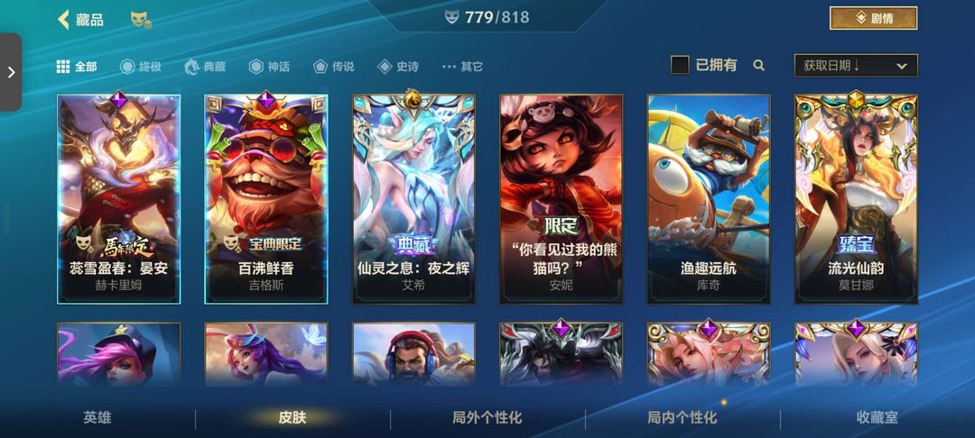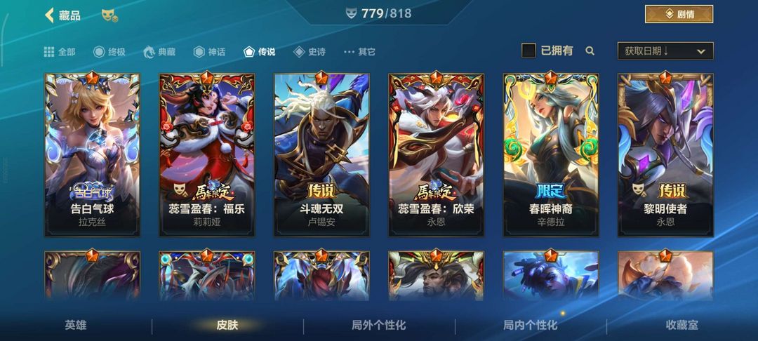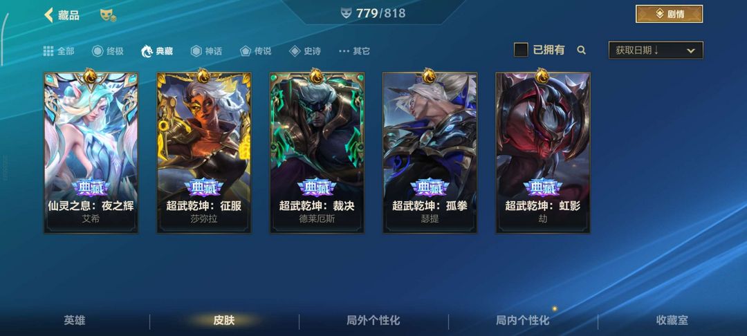 装备描述:818款皮肤已有779款,最新皮肤.,满英雄,水晶玫瑰系列全套,至臻系列,海克斯系列