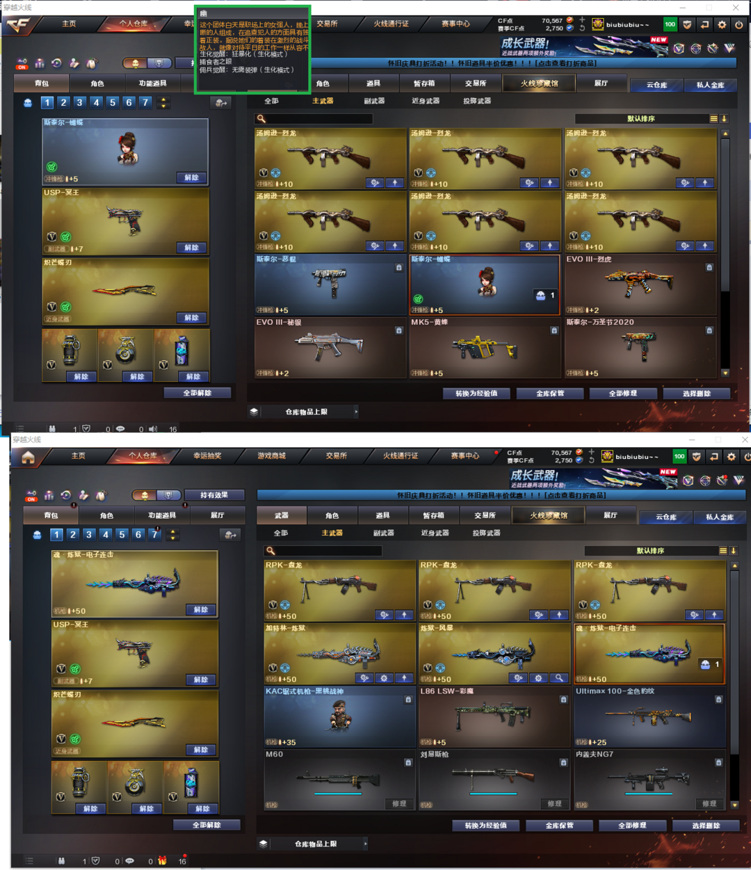 装备描述:排位:可以、、、、、、、、、、生化全装(看血量):无需换弹、6烈龙、3盘龙、炼狱、斯泰尔蝴蝶、死亡之眼、MAC涂鸦、炽芒蝶刃、超级对讲机、弹匣都有、、、、、、、、、、、、爆破四防:幻神(冠军之幻)、98K星神、、、、、USP冥王、2个USP雷暴、COP堕天神、COP雷霆王者、2个柯尔特世冠、柯尔特竞技荣光、冠军之特、COP雷霆王者、、、G36幻影、传说圣谕、QBZ王者蔷薇、白虎、传说光耀、炽芒碟刃、、、火麒麟音效、毁灭音效、黑骑士音效、、、爆破四防(传说女帝、王者春、王者貂蝉)