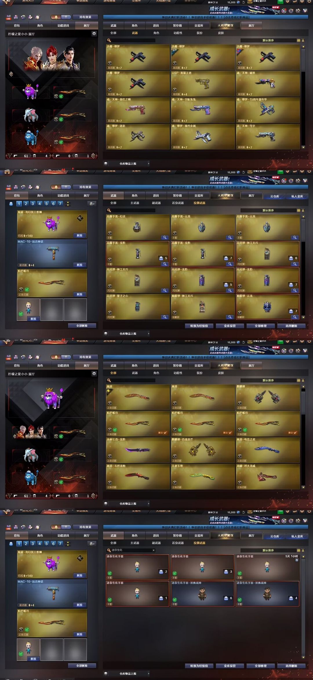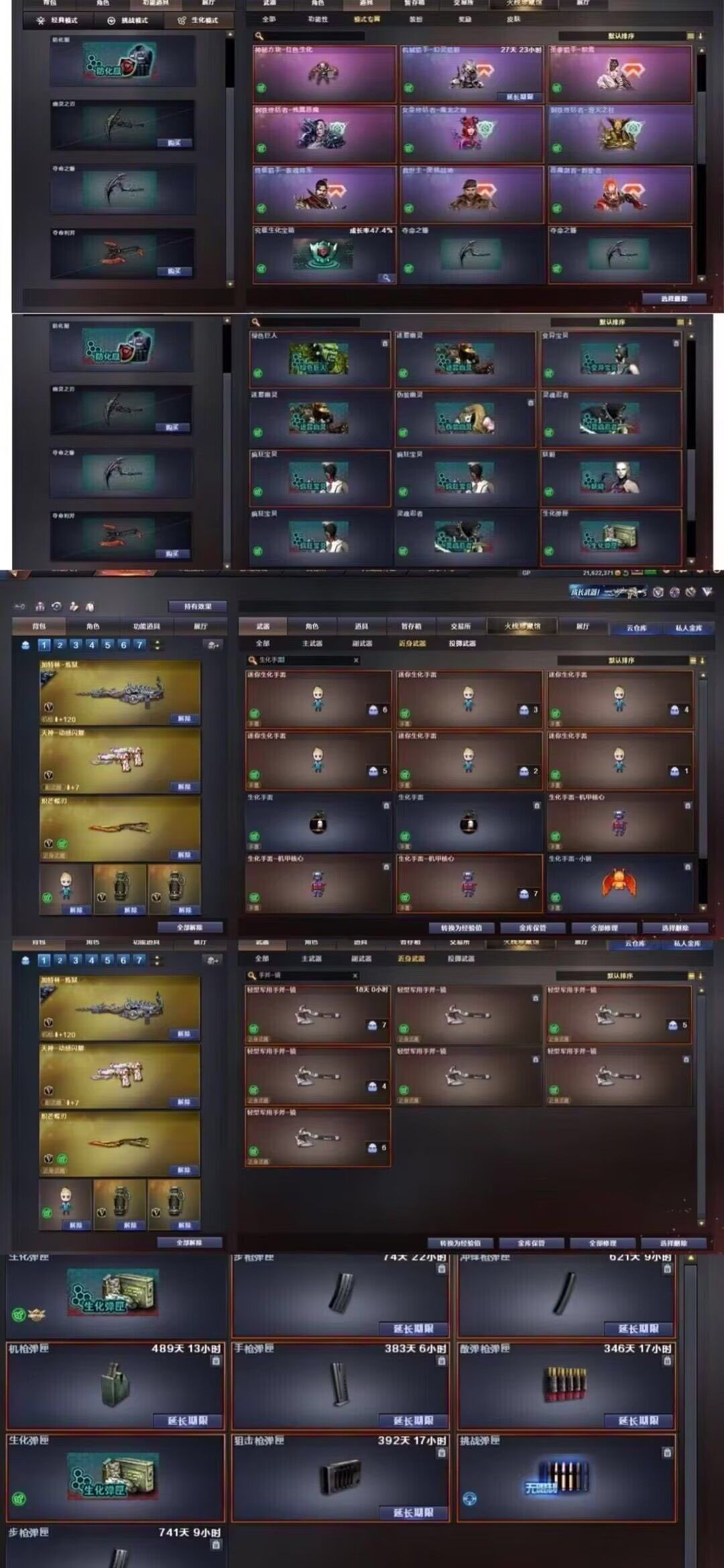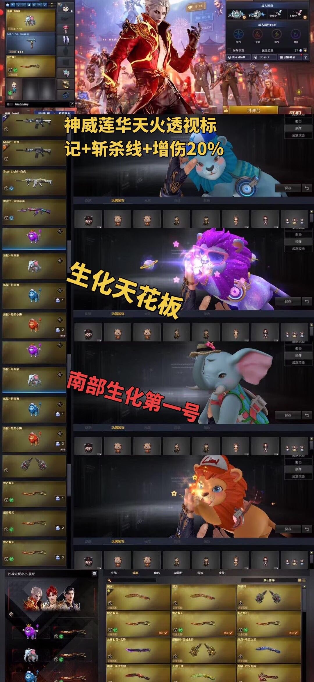 装备描述:生化顶级天花板 ;传说神威莲华生化最高级别-以打生化为主。大家不要乱刷属型。新加3把蝴蝶刀泡泡象国王狮、够你们背包来回切换/神威莲华生化最强 角色奇幻炼狱狮1800发----V角色每天都有一次免费选择属性的机会,四防英雄角色司雨影豹六防葵生化常用属性【生化背包变更,捕食者之眼-无需换弹,狂暴化,移动速度,生存本能】、尽量换这几个生化属性,老铁们可根据需要选择其他角色刷属性,觉得好的老铁们可进行收藏账号,收藏之后在租号玩网页版或手机APP上租号能便宜很多,注各位玩的开心,快乐