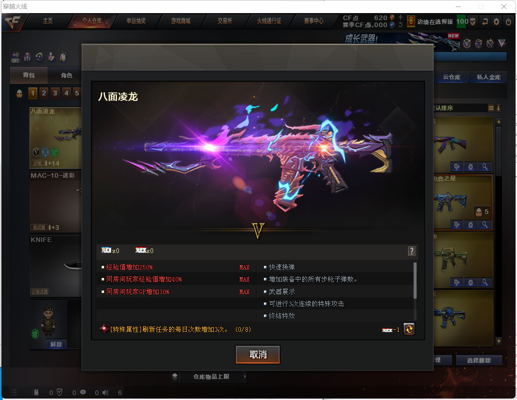 限制: 租号3次及以上 | 撤单率<90%才可租用此帐号装备描述:生化炽芒蝶刃♉满氪八面凌龙♉清道夫斯泰尔蝴蝶♉6盘6烈♉幻神炼狱音效卡四防生化背包♉满榴弹不退包全鬼