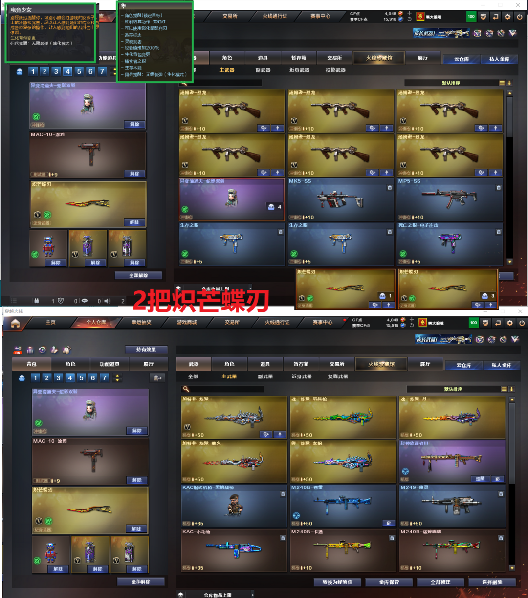 装备描述:排位:可以----------生化四防全装(可以变更背包、看僵尸血量)无需换弹、6烈、炼狱、异变清道夫-小人枪、MAC涂鸦、手斧镜、2把炽芒蝶刃、生化雷、生化弹匣、全部弹匣、、、、、、、、、、、、爆破四防:幻神(电流骇客)、传说幽瞳、幻神竞技荣光、王者风神、98K星神、3个USP冥王、柯尔特竞技荣光、G36幻影、神威天绫、白虎、白虎玄豹、QBZ天罚、QBZ金色蔷薇、、、蔷薇音效、天罚音效、极光音效、黑骑士音效、、、1套玄豹、2套竞技荣光、、、生化四防(隼、蛇隐宗、电竞少女)爆破四防(云悠悠、关小雨、晴雅、雨墨)