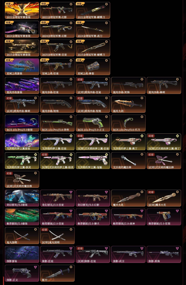 装备描述:千灵狂徒25冠军22冠军朋克3.0超时空狂徒光荣狂徒24冠军混沌显卡爪艾沃莉掠影威龙之刃剥皮刀创纪元狂徒电音幻影暗夜幻影洪荒狂徒塑水宗狂徒紫金狂徒侦查幻影堕天冥驹上古冥驹千灵冥驹离子冥驹暗夜飞将vct标配