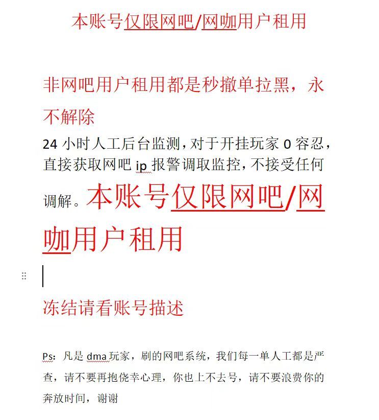 装备描述:租前请检查电脑是否存在违规插件,若使用违规插件导致封号,必定追究其法律责任。 禁止动排位!禁止动排位!禁止动排位!禁止动排位!动排位全网拉黑用不解除,后台24小时检测,违规直接秒顶拉黑 1.需要号主辅助上号,不然上不去,出现冻结需要v我YUTU-lang才能解,5分钟后还是上不了自行撤单不扣款 2.不接受第三方平台转租,后台24小时监测,请使用租号玩官网或者租号玩app进行下单 3.只接网吧/网咖订单,暂时不接家庭电脑订单和电竞酒店订单,家庭电脑下单秒拉黑,请注意 4.机制已改,匹配不允许出现炸鱼情况,人头数最高控制在25个左右,不要超30个,违者秒拉黑,内战自定义不限制 5.租号玩手机app和网页版会便宜很多