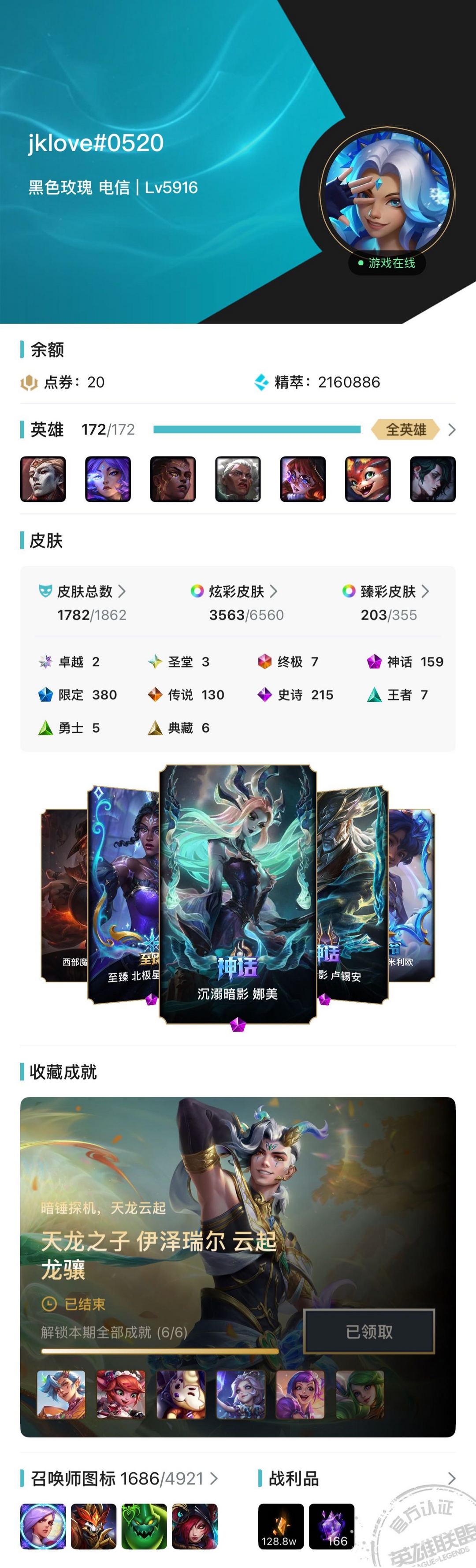黑色原皮1782可排位⚡️203臻彩⚡️3500炫彩⚡️签名版卡莎⚡️签名版不朽阿狸⚡️神话卢娜