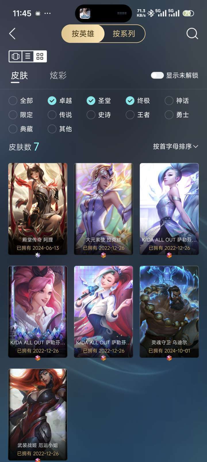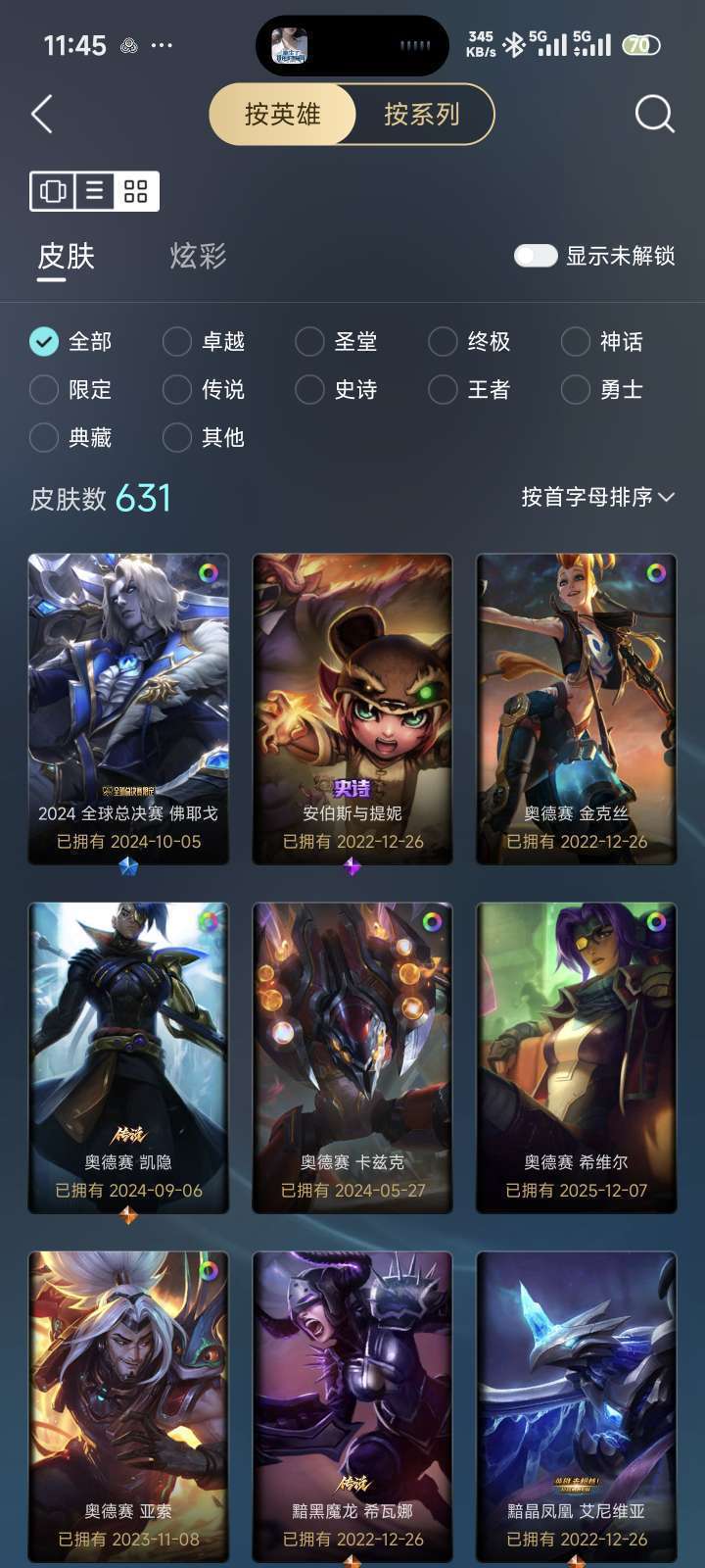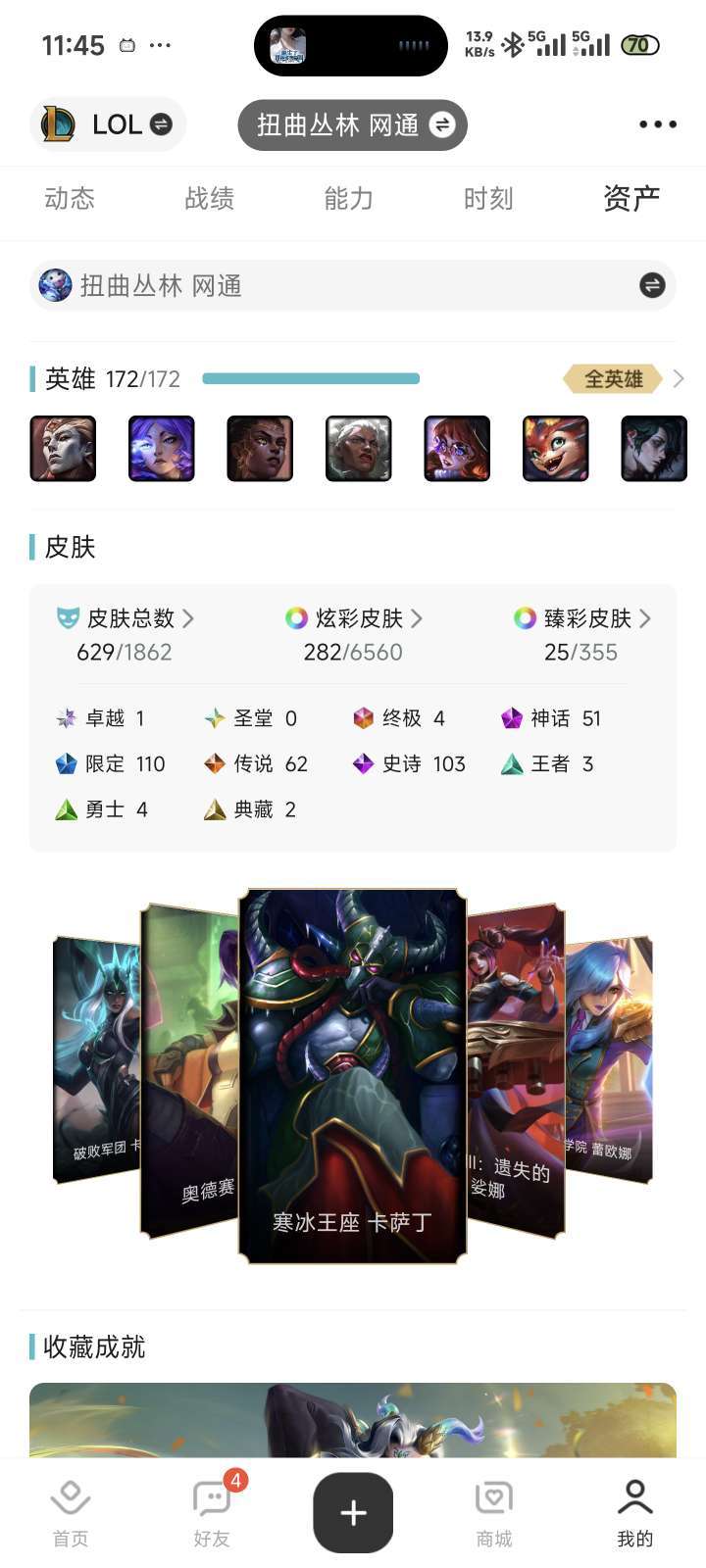 装备描述:629个皮肤,282个炫彩,25个臻彩女大自用一手新可排位
