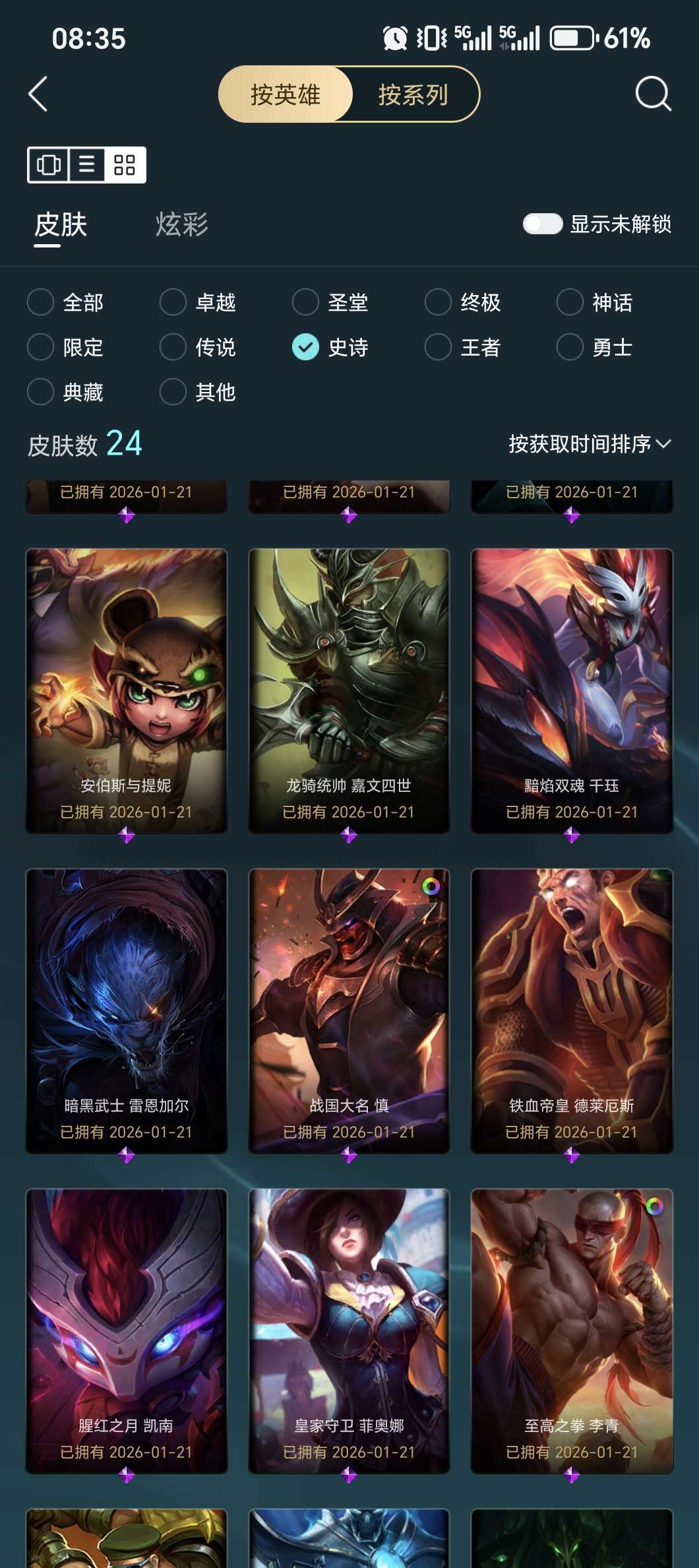 皮肤 110 个 满英雄 灵活白金 1, 大部分英雄都有皮肤,转区过来的 单双暂无段位