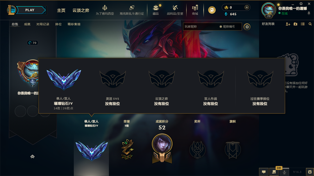 装备描述:~可排位~租之前尽量查一下游戏ID.确保段位是您需要的.避免浪费您的时间 ~请勿逃跑挂机送人头