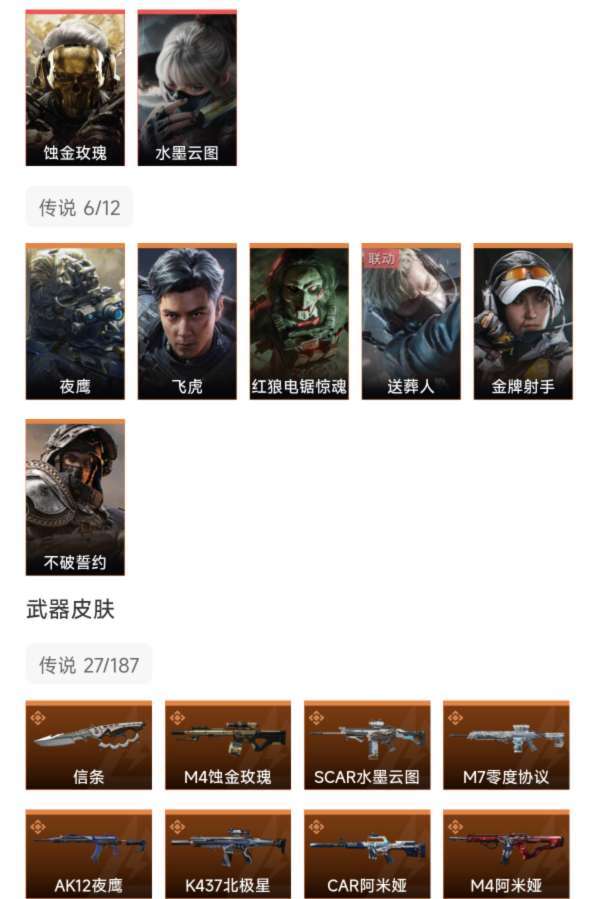 装备描述:8干员2红1刀,吴彦祖,蚀金玫瑰,水墨云图,信条,27款传说枪皮肤