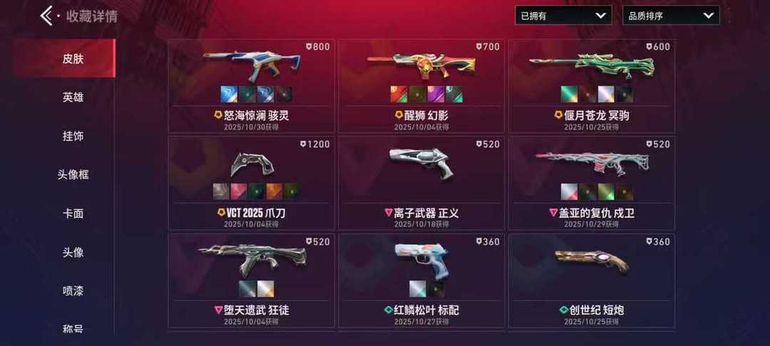 观察期22级收藏家VCT爪刀怒海惊澜 骇灵醒狮 幻影 偃月苍龙 冥驹 离子武器 正义 盖亚的复仇 戍