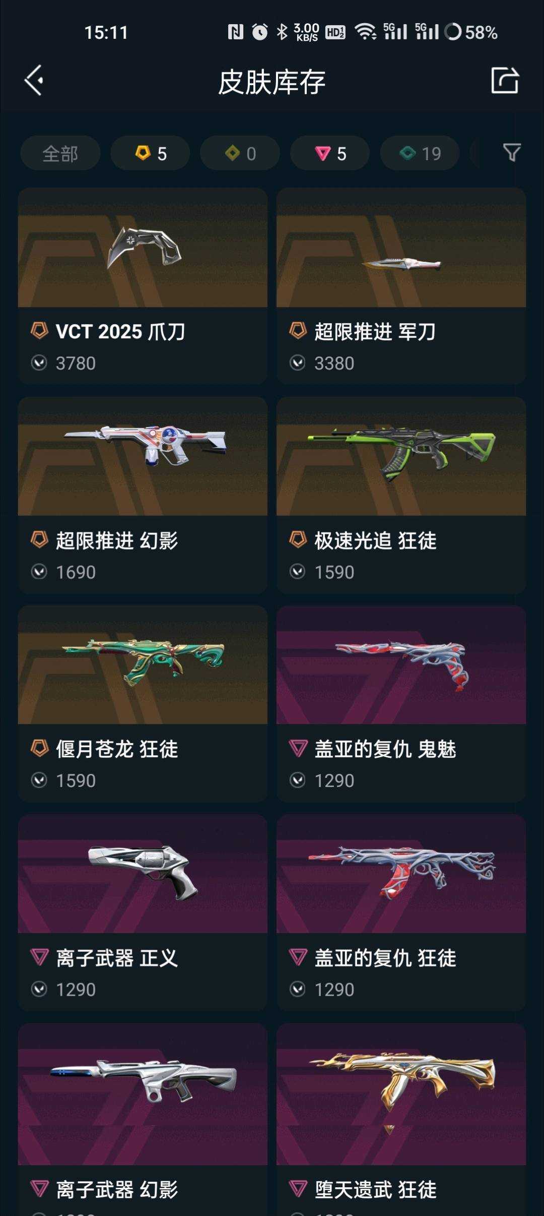 VCT爪刀⭐超限推进军刀幻影⭐盖亚狂徒鬼魅⭐极速光追狂徒⭐偃月苍龙堕天遗武狂徒⭐离子幻影正义