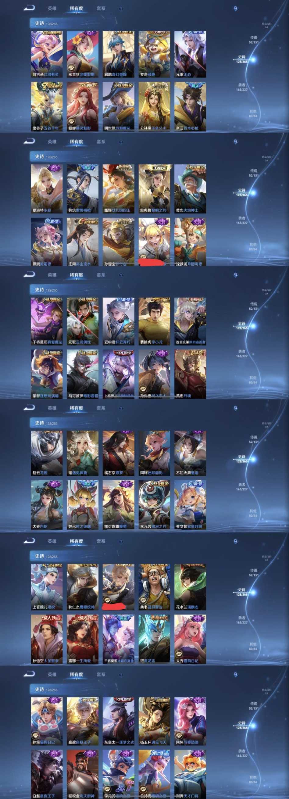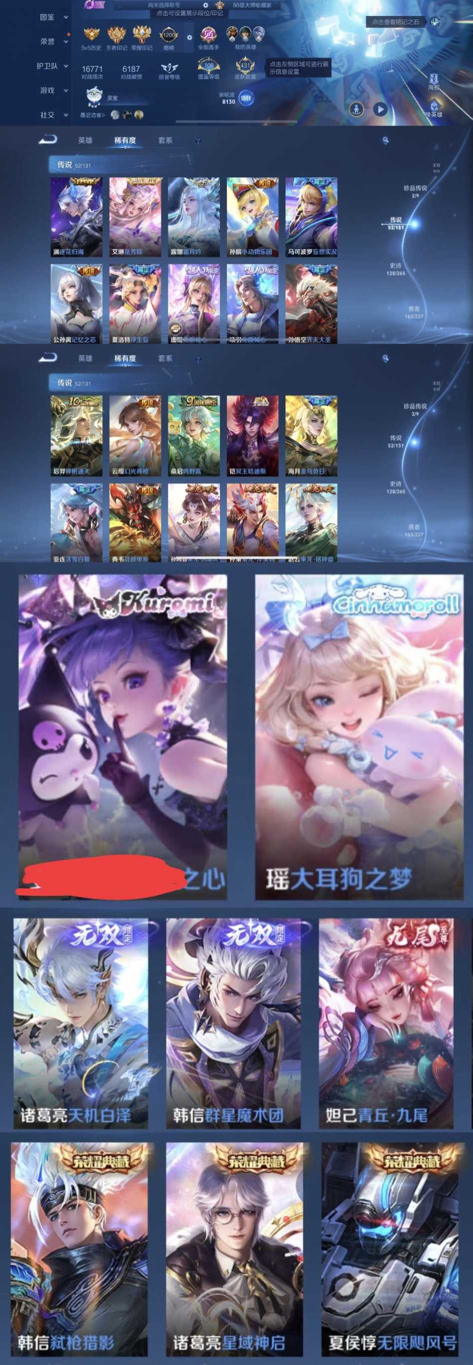 限制: 租号2次及以上 | 撤单率<49%才可租用此帐号装备描述:时间到了还登录白玩或者顶号全部改密拉黑处理永不解除,顶号机器会秒禁玩改密,顶号不仅拉黑还没得玩,赚三两块不容易,请理解谢谢。 ❤❤❤❤❤❤❤❤❤❤❤❤ 请勿开挂,挂机,送头,骂人,撤单后游戏等如有违规永久拉黑永不解除。 重置二级密码不要费劲了,号主每天都会上号查看,多行不义必自毙,人在做天在看,多做好事多自律,少做缺德事 该号英雄127个皮肤431个,典藏3个,无双3个,珍品传说2个,星传说6个,传说52个,史诗128个,祝你游戏愉快~