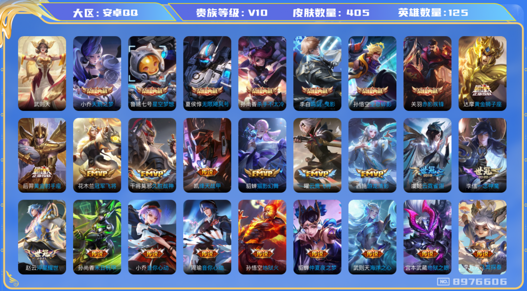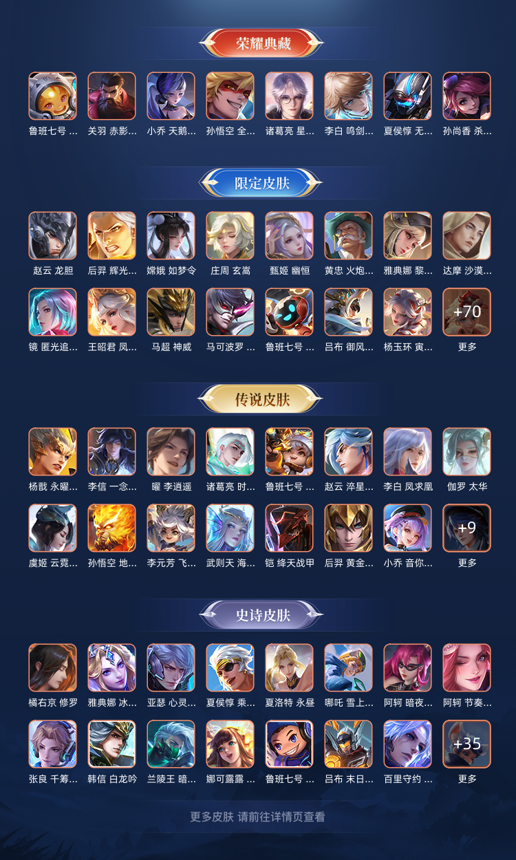 装备描述:181区羽(关羽 赤影疾锋,关羽 天启骑士,关羽 龙腾万里,关羽 冰锋战神,区标);杨戬(杨戬 天秀·启明,杨戬 埃及法老,杨戬 次元傲视,杨戬 永曜之星);诸葛亮(诸葛亮 星域神启,诸葛亮 掌控之力,诸葛亮 时雨天司,诸葛亮 黄金分割率,诸葛亮 星航指挥官,诸葛亮 武陵仙君);干将莫邪(干将莫邪 真爱魔法,干将莫邪 久胜战神,干将莫邪 冰霜恋舞曲,干将莫邪 第七人偶);马可波罗(马可波罗 潮玩牛仔,马可波罗 逐梦之星,马可波罗 暗影游猎,马可波罗 激情绿茵);李白(李白 鸣剑·曳影,李白 千年之狐,李白 凤求凰,李白 敏锐之力,李白 范海辛);孙悟空(孙悟空 孙行者,孙悟空 全息碎影,孙悟空 地狱火,孙悟空 大圣娶亲,孙悟空 美猴王,孙悟空 西部大镖客);孙尚香(孙尚香 沉稳之力,孙尚香 杀手不太冷,孙尚香 末日机甲,孙尚香 水果甜心,孙尚香 火炮千金);韩信(韩信 傲雪梅枪,韩信 逐梦之影,韩信 街头霸王,韩信 飞衡,韩信 白龙吟,韩信 教廷特使);裴擒虎(裴擒虎 擒涛扼浪,裴擒虎 寅虎·赤拳,裴擒虎 街头旋风,裴擒虎 李小龙,裴擒虎 天狼狩猎者);马超(马超 幸存者,马超 神威)