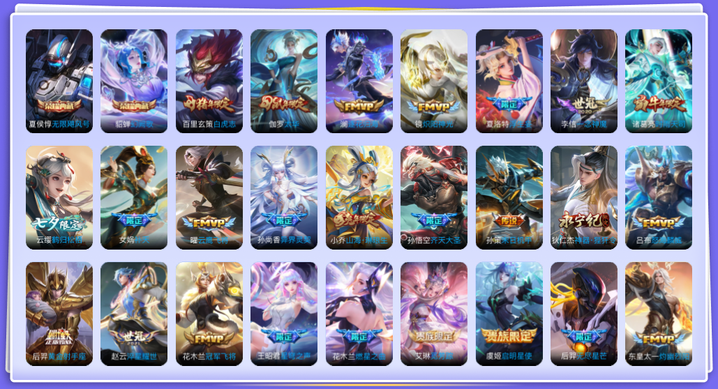 装备描述:67区 英雄数: 126 皮肤数: 429 荣耀水晶: 无限飓风号,幻阙歌 传说皮: 黄金射手座,冠军飞将,云鹰飞将,炽阳神光,一念神魔,淬星耀世,末日机甲-孙策,神器·狴犴令,山海·琳琅生,燃星之曲,浮生妄,百相守梦(张飞),灼幽烈阳,鹤归松栖(云缨),澜逐花归海,艾琳觅芳踪 限定皮: 遇见飞天,李小龙,游园惊梦,梁祝,时雨天司,异界灵契,神威,蜜橘之夏,飞衡,太华,天狼征服者,冰霜恋舞曲,寅虎·御盾,白虎志,青龙志,瑞麟志,玄武志,朱雀志,梅西,一生所爱,大圣娶亲,高山流水,孙行者,猪悟能,匿光追影者,女儿国国王,寅虎·展翼,补天,百木心枪,玉兔公主,匿光决锋者,无尽星芒,唐三藏,星穹之声,五谷丰年,神器·万象笔,梦圆繁星,怒海麟威,齐天大圣,至美·乘鲤谣
