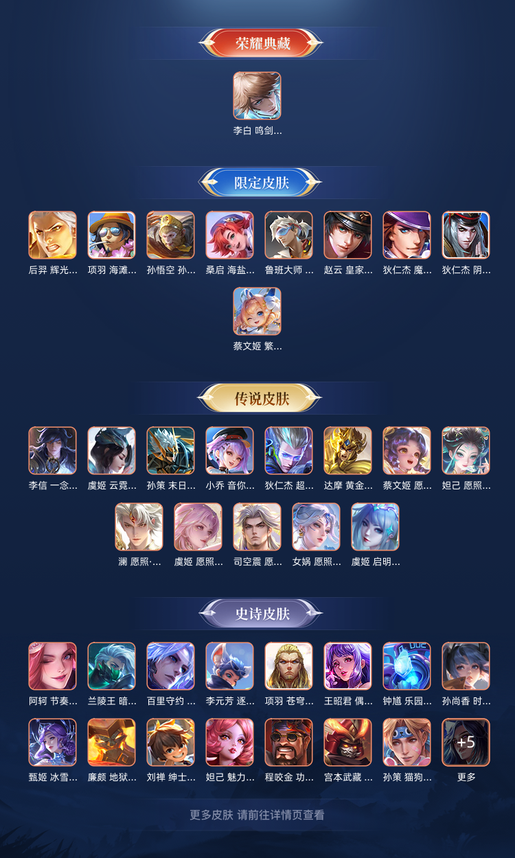 装备描述:荣耀水晶: 鸣剑·曳影 珍品传说: 时之奇旅-孙策,酷洛米之心,大耳狗之梦 传说皮: 黄金狮子座,冠军飞将,炽阳神光,一念神魔,云霓雀翎,音你心动-小乔,时之恋人-刘备,超时空战士-狄仁杰,末日机甲-孙策,澜逐花归海,琥珀纪元马超,乘龙·问璇玑,乘龙·铭钟鼎,乘龙·淬吴钩,吕布曦玄引,落雪白狼,幻光神枪 限定皮: 辉光之辰,孙行者,夏侯惇霜北刀,鸣野蒿,愿照·千秋盛,愿照·众生和,愿照·山河定,愿照·岁时盈,愿照·福禄聚,愿照·九州拓
