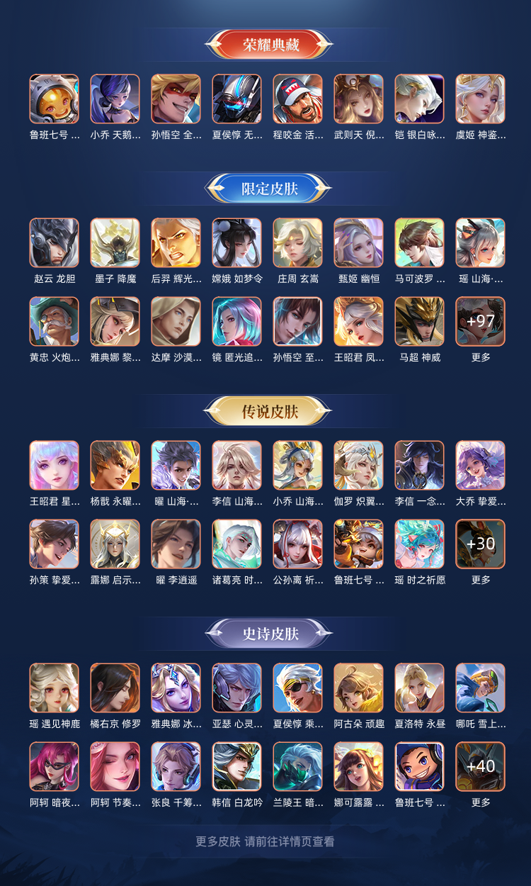装备描述:荣耀水晶: 武则天,天鹅之梦,星空梦想,倪克斯神谕,无限飓风号,活力突击,全息碎影,银白咏叹调,神鉴启示录 传说皮: 黄金狮子座,黄金射手座,冠军飞将,云鹰飞将,黄金白羊座,猫影幻舞,久胜战神,炽阳神光,一念神魔,云霓雀翎,末日机甲-孙尚香,地狱火,仲夏夜之梦,零号·赤焰,海洋之心,地狱之眼,飞鸢探春,音你心动-周瑜,胖达荣荣,李逍遥,乞巧织情,时之恋人-刘备,游龙清影,淬星耀世,超时空战士-狄仁杰,末日机甲-孙策,花朝如约,挚爱之约,挚爱花嫁,无双飞将,神器·狴犴令,山海·炽霜斩,山海·琳琅生,山海·苍雷引,炽翼辉光,画中仙,浮生妄,百相守梦(张飞),灼幽烈阳,妄想实况,遇见神鼓,鲁班七号-时之奇旅,澜逐花归海,艾琳觅芳踪,琥珀纪元铠,琥珀纪元马超,乘龙·问璇玑,乘龙·铭钟鼎,乘龙·淬吴钩,貂蝉曦玄引,吕布曦玄引,落雪白狼,金乌负日 限定皮: 冰锋战神,遇见飞天,李小龙,奔雷神使,祈雪灵祝,游园惊梦,梁祝,御风骁将,云端筑梦师,时雨天司,引擎之心,龙胆,白鹤梁神女,武圣,烈魂,魔法小厨娘,辉光之辰,异界灵契,玄嵩,白晶晶,岱宗,天狼溯光者,虎魄,天魔缭乱,神威,蜜橘之夏,永曜之星,幽
