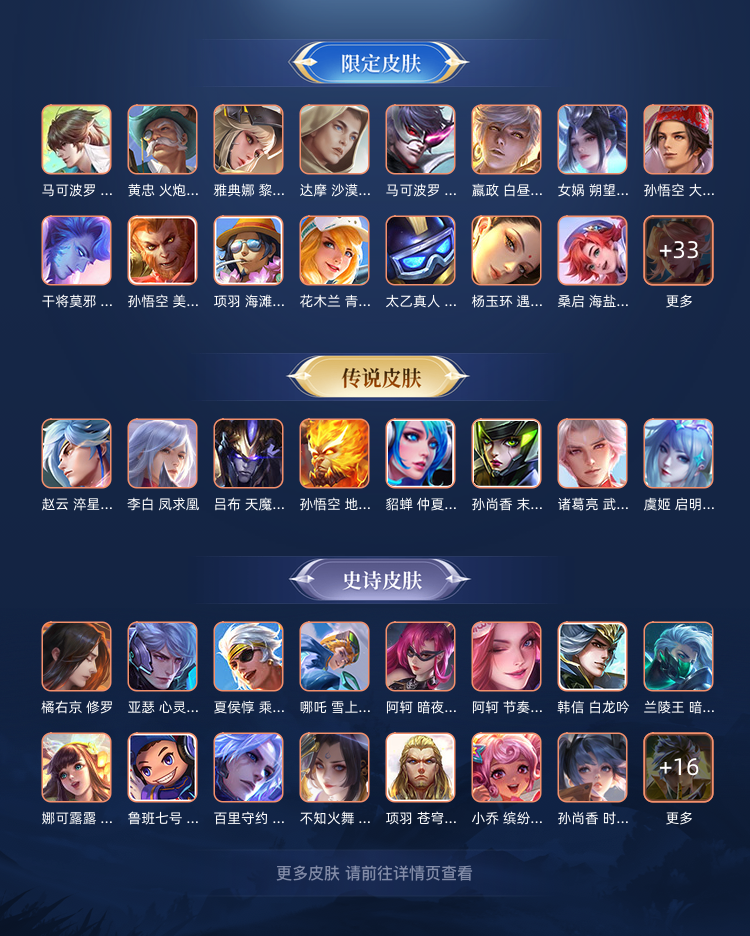 装备描述:皮肤数: 259 传说皮: 猫影幻舞,久胜战神,末日机甲-孙尚香,地狱火,仲夏夜之梦,淬星耀世,幻光神枪 限定皮: 遇见飞天,李小龙,梁祝,魔法小厨娘,天狼溯光者,天魔缭乱,蜜橘之夏,青春决赛季,冰霜恋舞曲,天狼绘梦者,凤求凰,美猴王,武陵仙君,如梦令-后羿,大圣娶亲,默契交锋-花木兰,山海·玄木吟,鸣野蒿