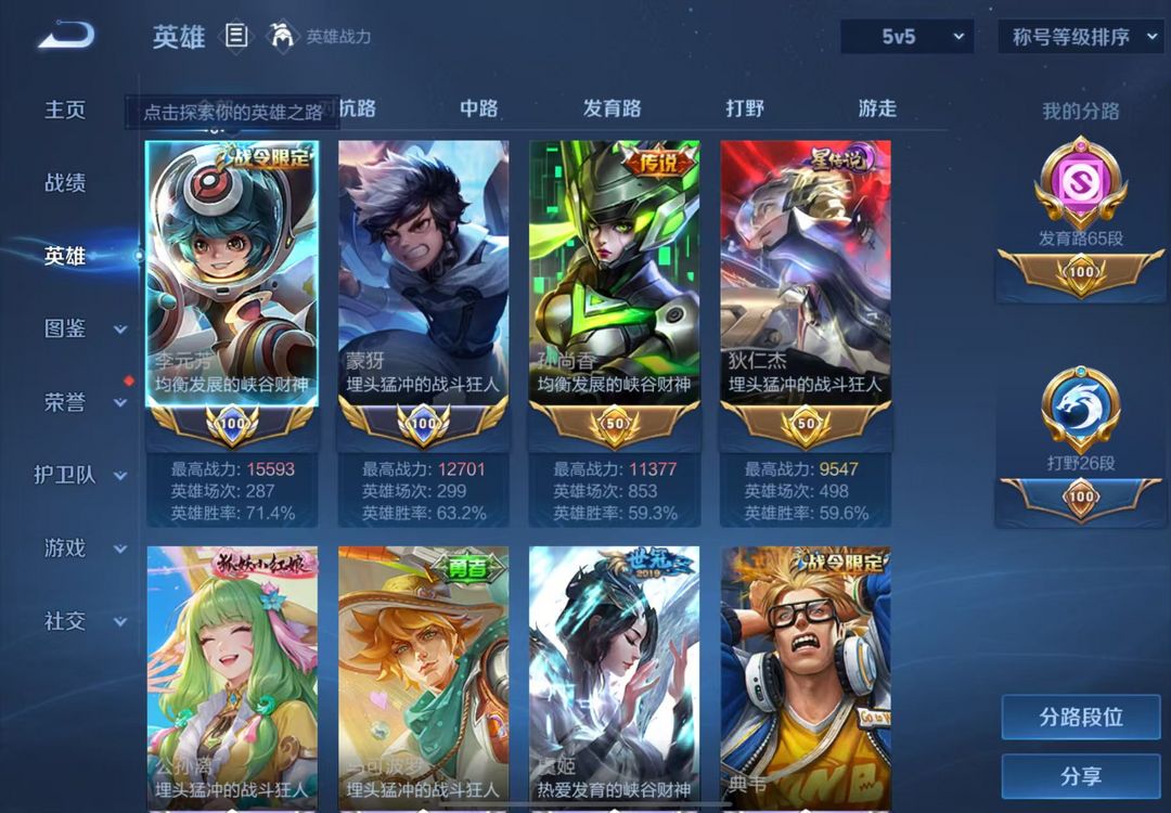装备描述:发育路65段国服1.5战李元芳国服蒙犽金标孙尚香金标狄仁杰