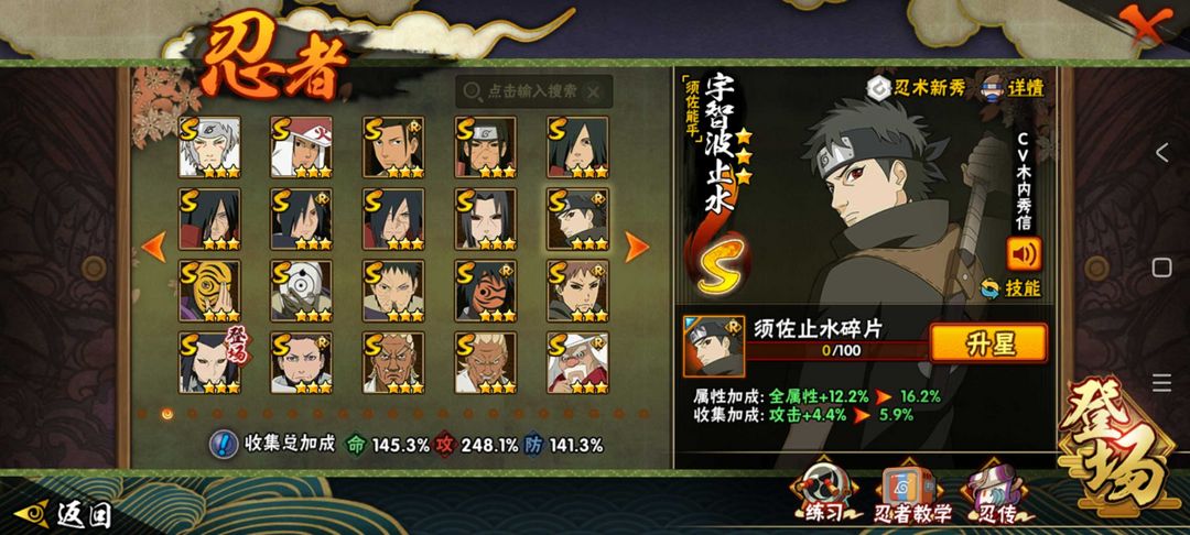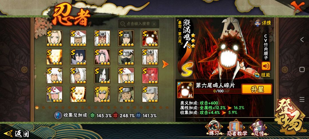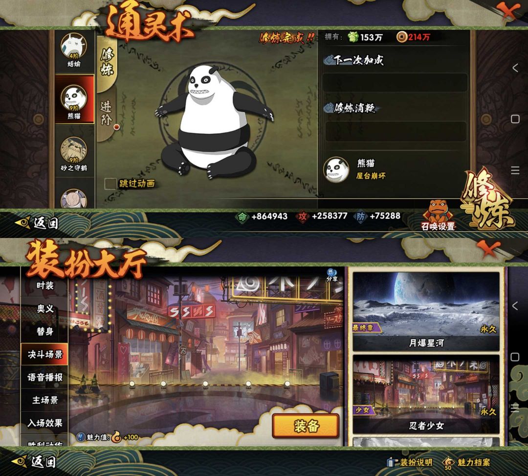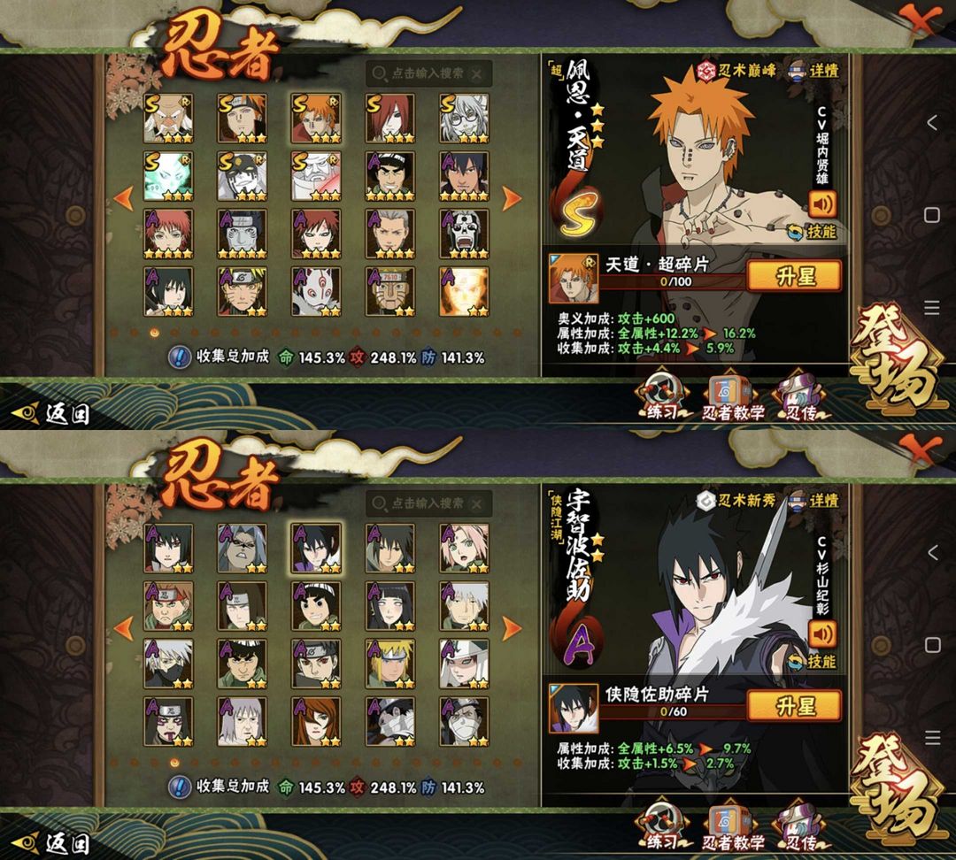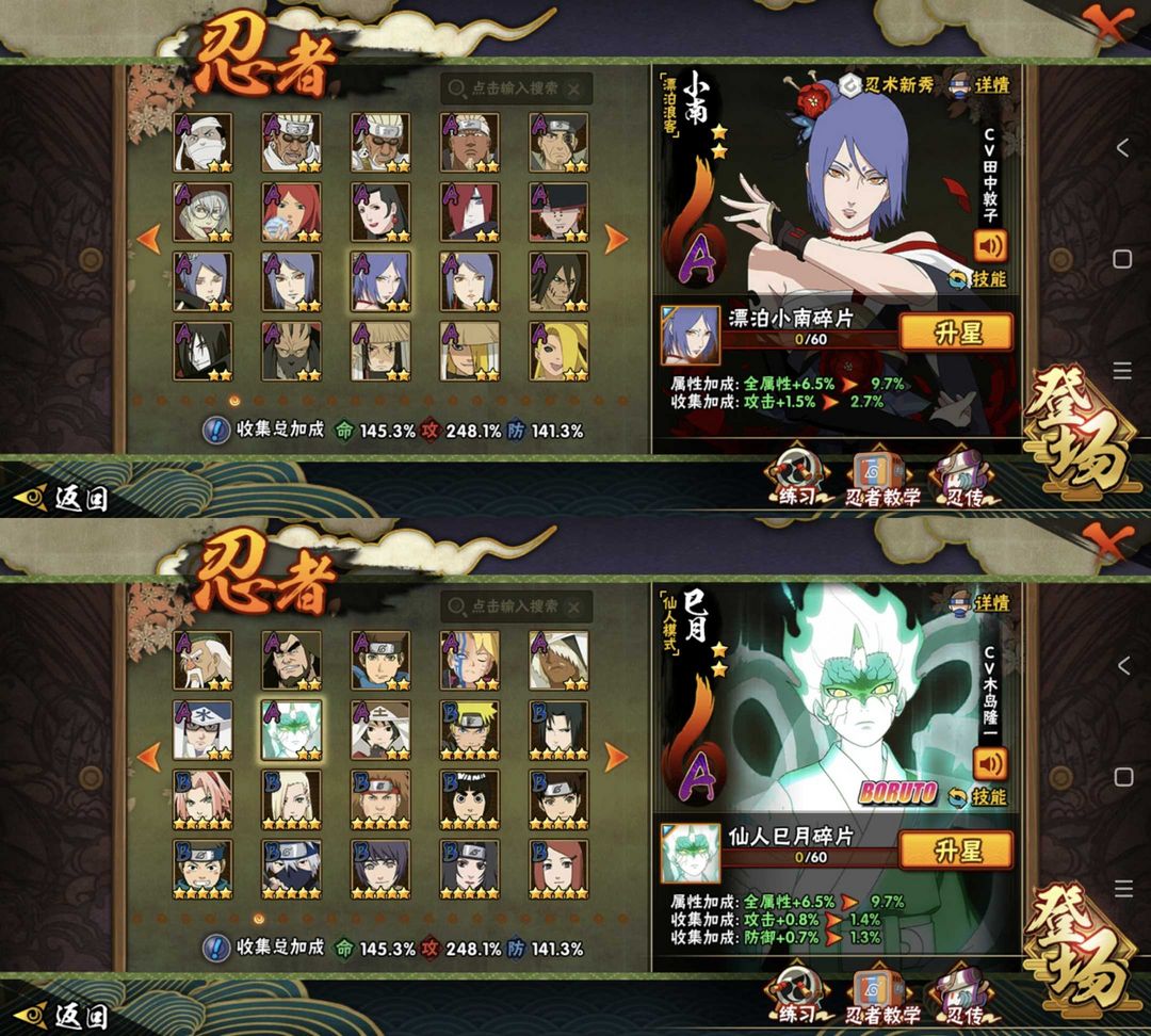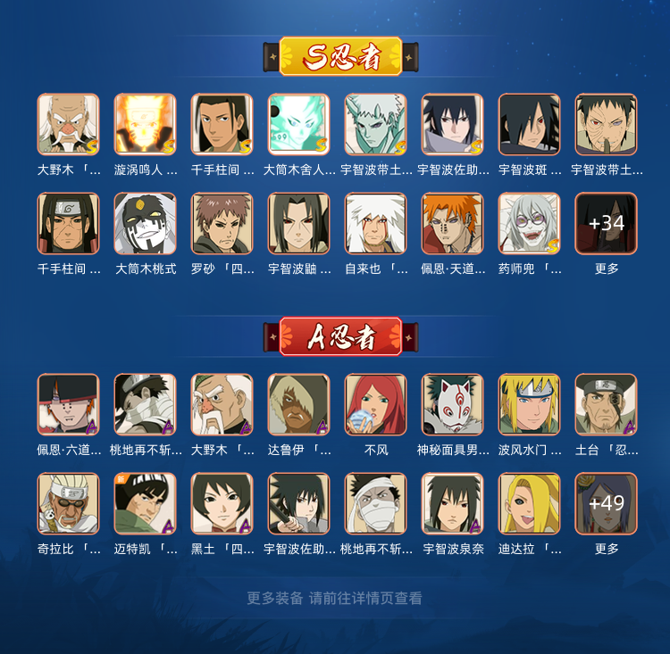 装备描述:300忍者✨鬼鲛皮肤狂野鲛鲨✨阿斯玛桀骜之刃✨凯钢铁之躯 S忍者✨51S✨六尾鸣人✨九喇嘛鸣人✨永恒佐助✨忍战小樱✨须佐卡卡西✨传说自来也✨百豪纲手✨死门凯✨四代火影✨九喇嘛水门✨秽土四代✨秽土三代✨二代火影✨秽土二代✨初代火影✨创立柱间✨秽土初代✨斑✨秽土斑✨创立斑✨秽土解斑✨须佐鼬✨秽土鼬✨须佐止水✨神秘面具男✨白面具✨五影斑✨忍战带土✨红夜之刃面具男✨十尾带土✨罗砂✨三代目风影✨四代雷影✨忍战雷影✨忍战大野木✨天道✨天道超✨长门✨仙人兜✨大筒木舍人✨大筒木桃式✨大桐木金式 A忍者✨青春哥✨鸡翅佐助✨侠影佐助✨面麻✨新春水门✨漂泊再不斩✨漂泊六道✨泳装小南✨新春小南✨漂泊小南✨夏日鼬 VIP V15 装扮 魅力值50级 时装 稀有时装多 通灵 稀有通灵多,熊猫 决斗场景 忍者少女 奥义 稀有直购奥义多 战力 2300万